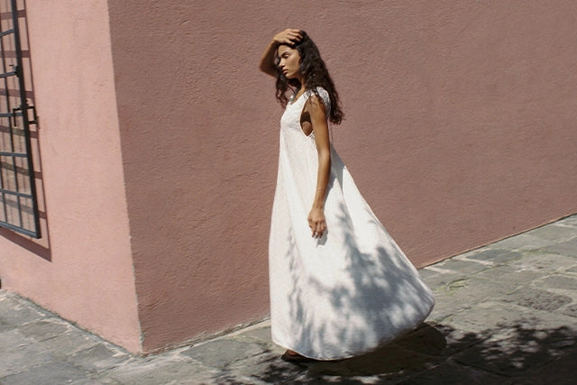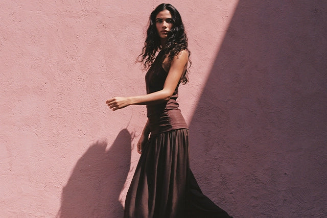 Rossana is wearing a size Extra Small and her measurements are Height: 5’11”, Bust: 30”, Waist: 22.8”, Hips: 35”. Please note Rossana is 5’11” and the length of the garment on her body is reflective of her height.